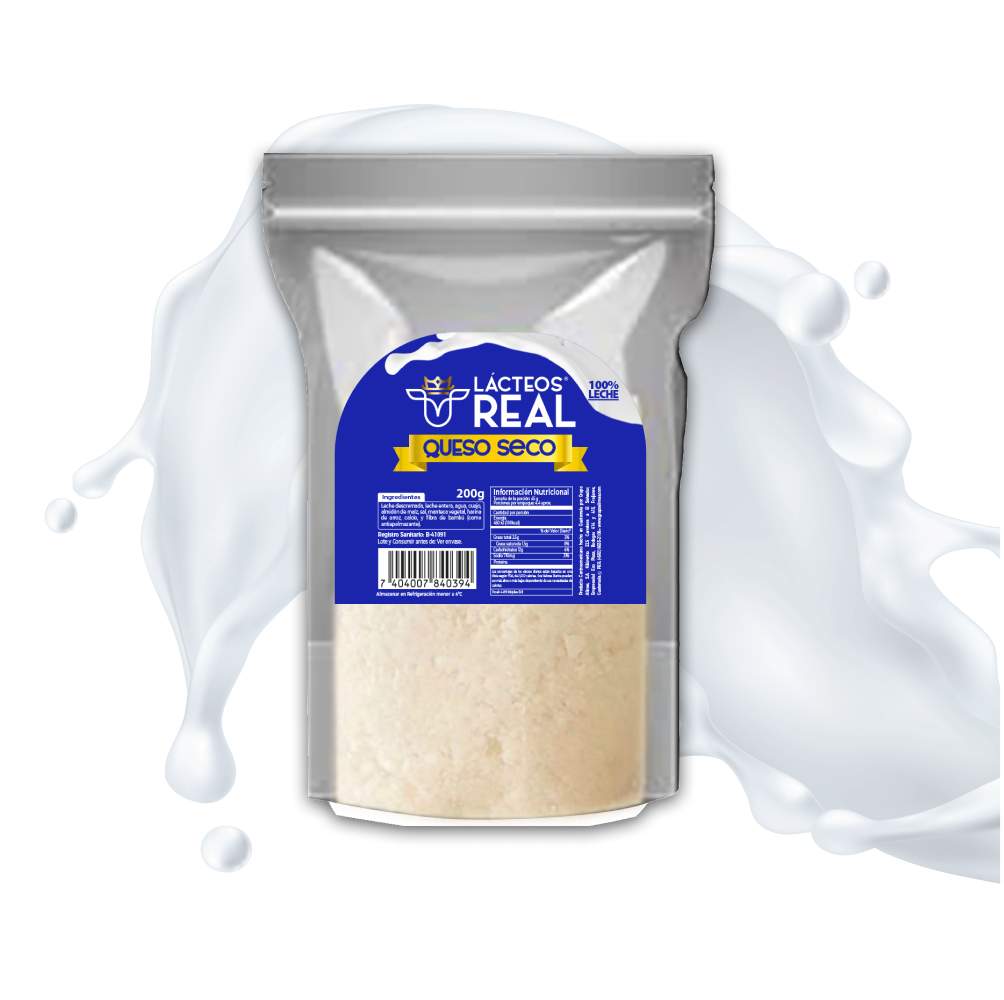 El Queso Seco Lácteos Real tiene la característica de haber perdido todo su suero, es más compacto y de sabor ligeramente salado, se elabora a base de leche fresca.